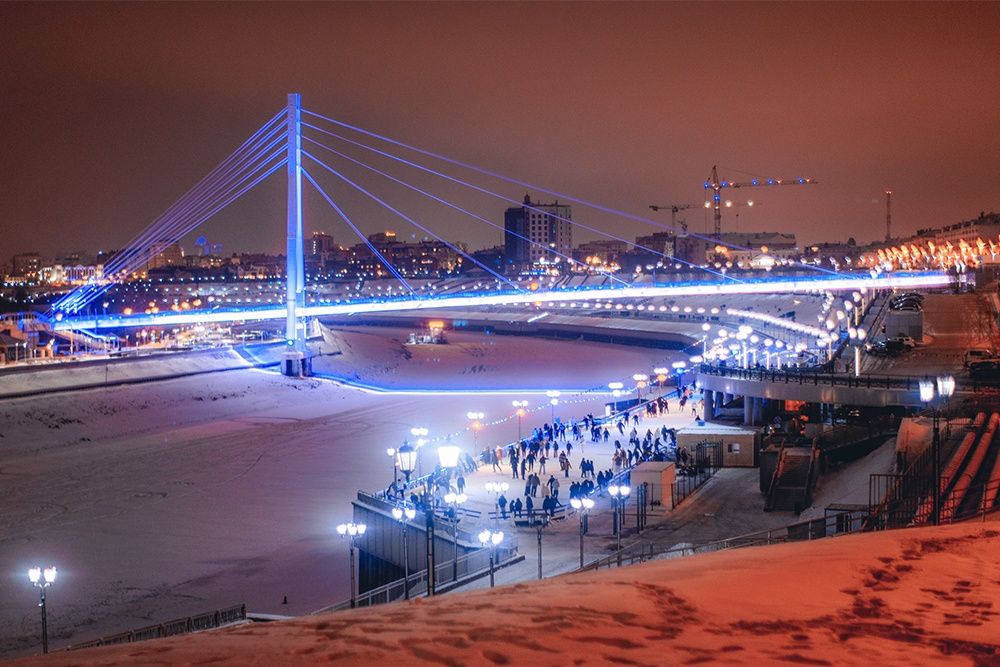 Зимой набережная преображается: каток с музыкальным сопровождением, ледяные горки с выкатом прямо к замерзшей Туре, праздничная иллюминация превращают прогулку в настоящую зимнюю сказку.